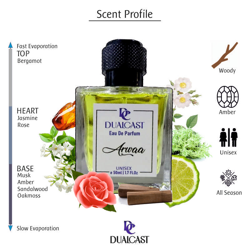 Arwaa by Oud Andrabia is a sophisticated unisex fragrance designed to captivate the senses through a harmonious blend of fresh, floral, and woody accords. Top Note (Fast Evaporation): A bright and refreshing burst of Bergamot introduces the fragrance with a citrusy zing that energizes and uplifts. Heart Notes: As the scent evolves, it transitions into a romantic floral bouquet of Jasmine and Rose, adding elegance and depth with their soft, intoxicating aroma. Base Notes (Slow Evaporation): The dry-down reveals a rich, warm base of Musk, Amber, Sandalwood, and Oakmoss, grounding the fragrance in sensual, earthy, and woody tones that linger beautifully on the skin. Fragrance Family: Woody Amber Gender: Unisex Season: All Season Wear